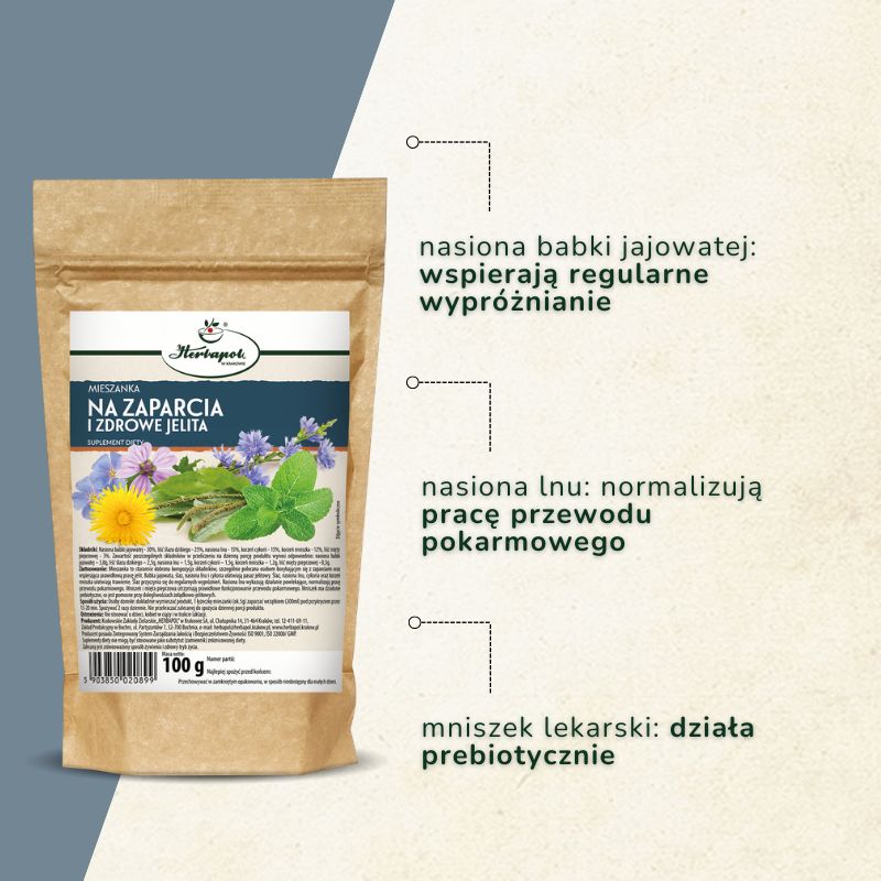 The mixture is a carefully selected composition ingredients, especially recommended for those struggling with constipation and supporting healthy bowel function. Psyllium, mallow, flax seeds, and chicory facilitate intestinal transit. Mallow, flax seeds, chicory, and dandelion root facilitate digestion. Mallow contributes to regular bowel movements. Flax seeds have a coating effect and normalize the digestive tract. Dandelion and peppermint maintain the proper functioning of the digestive tract. Dandelion has a prebiotic effect, which is helpful for gastrointestinal ailments.