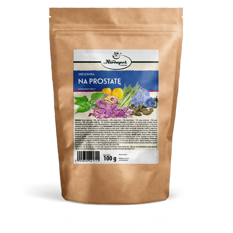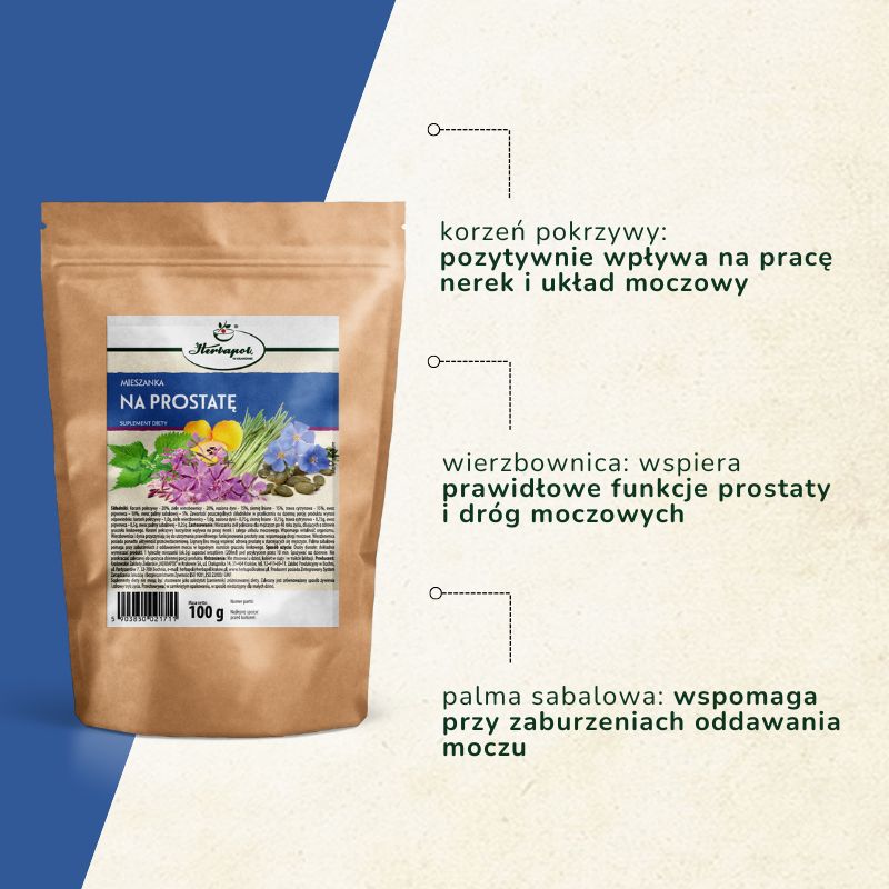 This herbal blend is recommended for men over 40 who care about the health of their prostate gland. Nettle root has a beneficial effect on the kidneys and the entire urinary tract. It supports the body's vitality. Willowherb and pumpkin contribute to maintaining the proper functioning of the prostate and support the urinary tract. Willowherb also has anti-aging properties. Flax lignans may support a healthy prostate in aging men. Saw palmetto helps with urination disorders in benign prostatic hyperplasia.